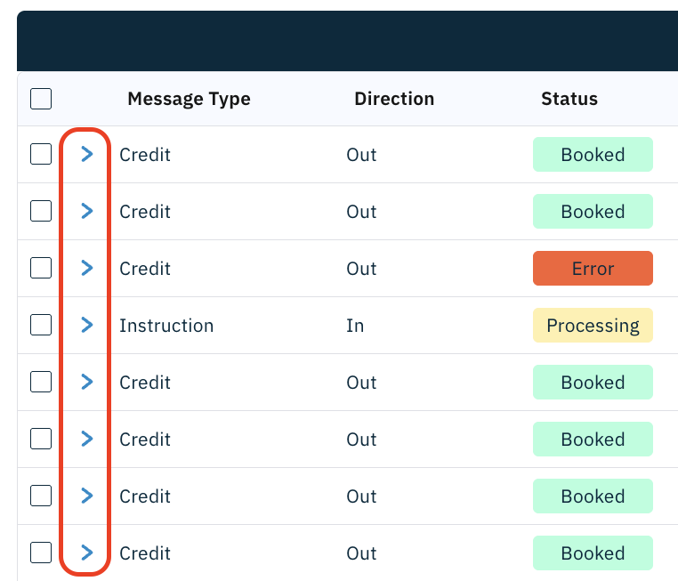 Rows in table views representing a transaction contain multiple related messages. These rows show a small arrow icon at the beginning.