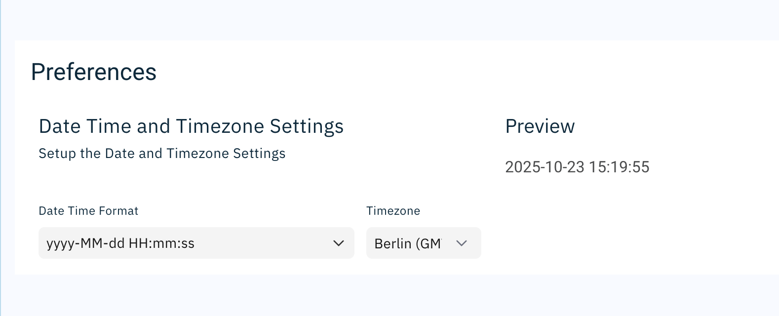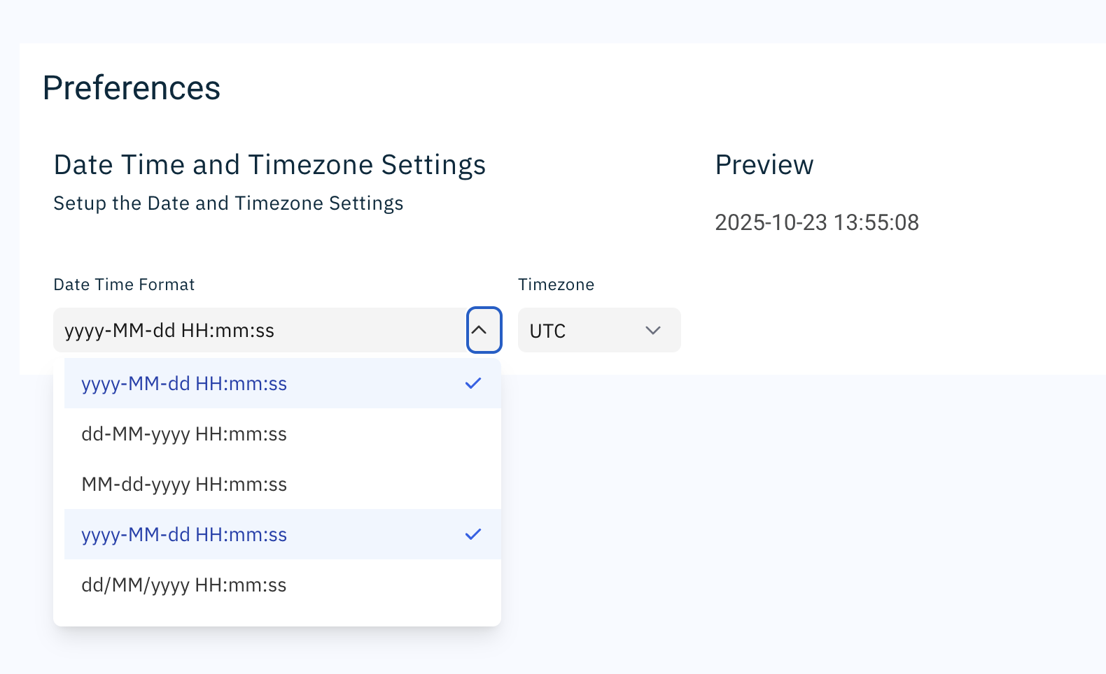 - Shows a live preview of how the selected date/time settings will appear throughout the system.