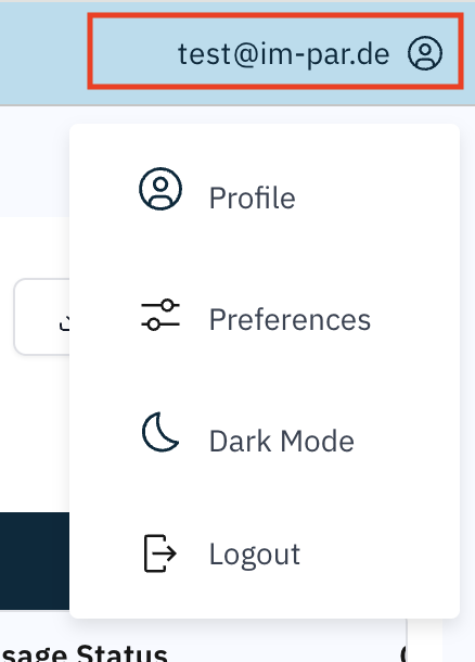 To open the User menu click on your user icon or email address in the top right corner and a dropdown menu will appear. From here you may