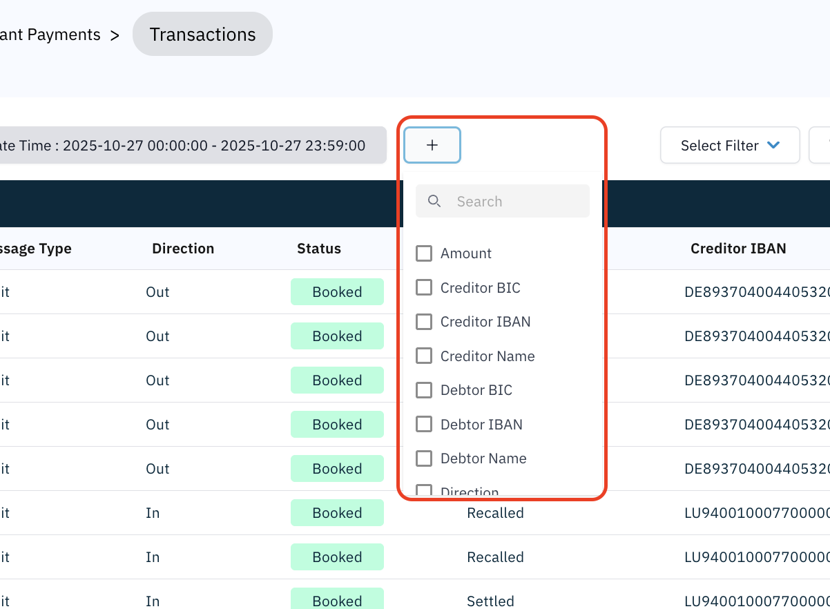 + button. This opens the filter selection menu.Example filter selection menu from SEPA Instant → Transactions: