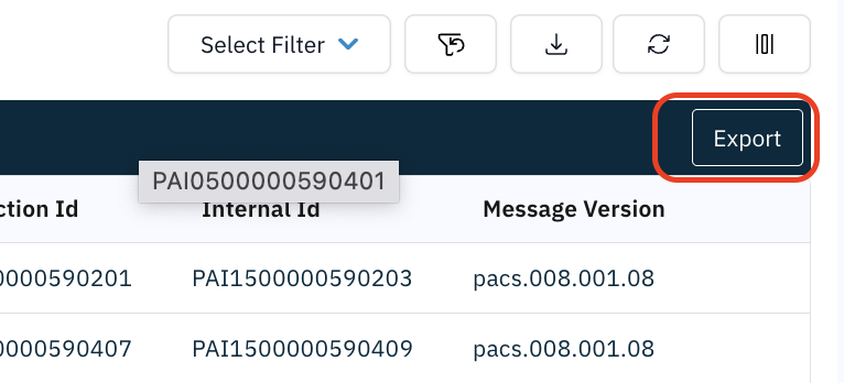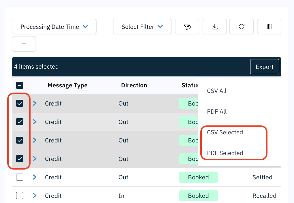- Configure all desired filter criteria in the Filter Panel (e.g., Message Type, Status, Date Range, Creditor, Amount).