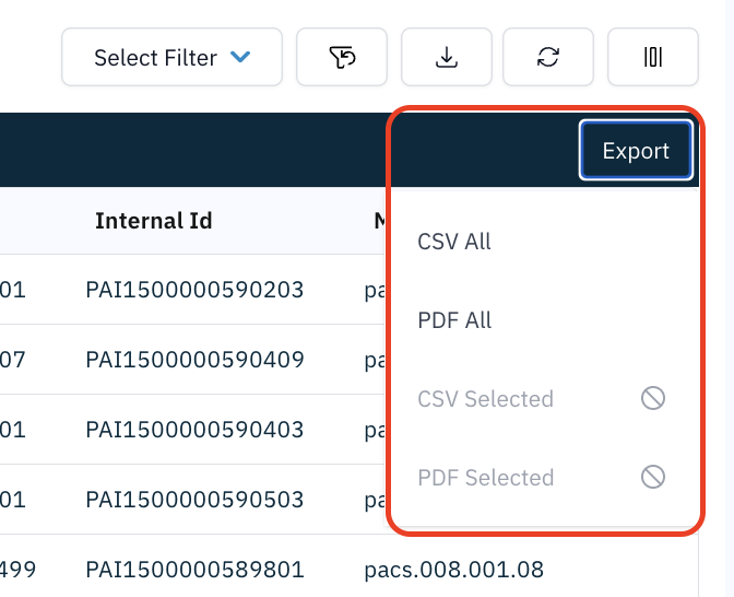 Exports include all visible columns and active filters. You can choose to export the full result set or select certain rows from the table and export only your selection.
