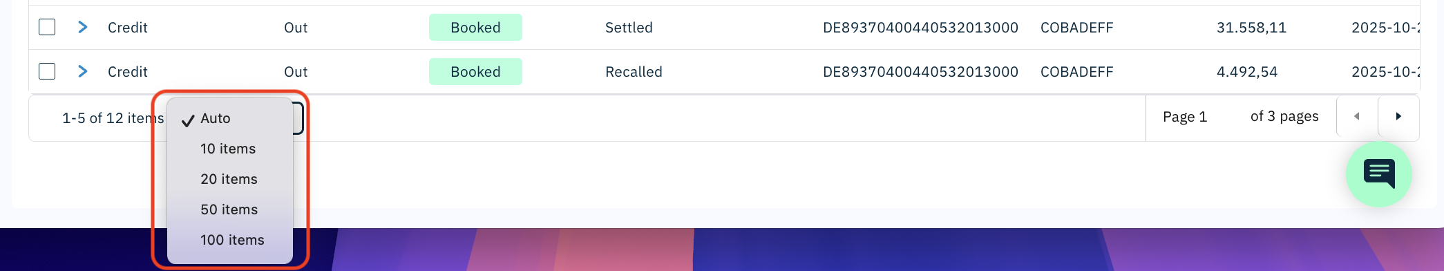 - Click the page size selector (default: Auto) to choose how many rows are shown per page: