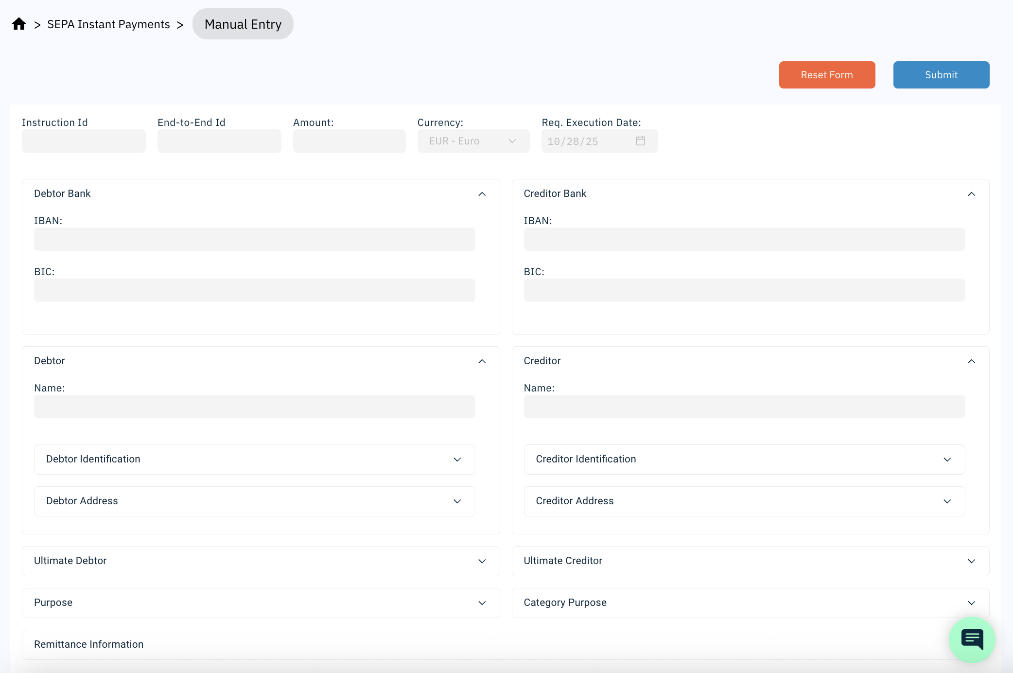 The SEPA Instant Manual Entry screen allows users to create a new SEPA Instant Credit Transfer manually.