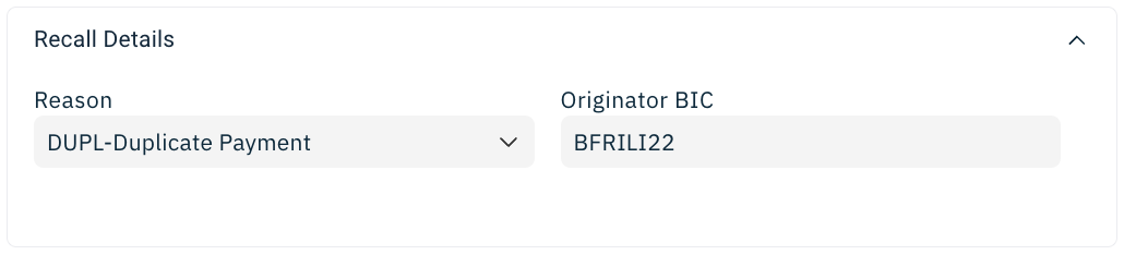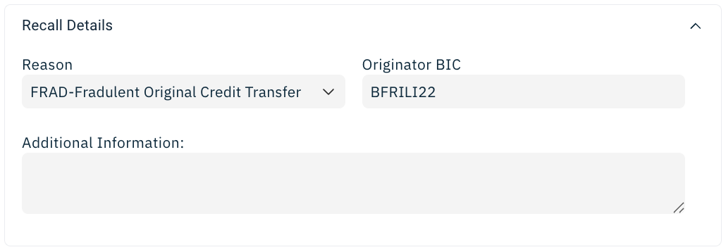 Clicking the button fills a new Recall message (camt.056) from the original Credit details and opens the Recall screen presenting this new transaction: