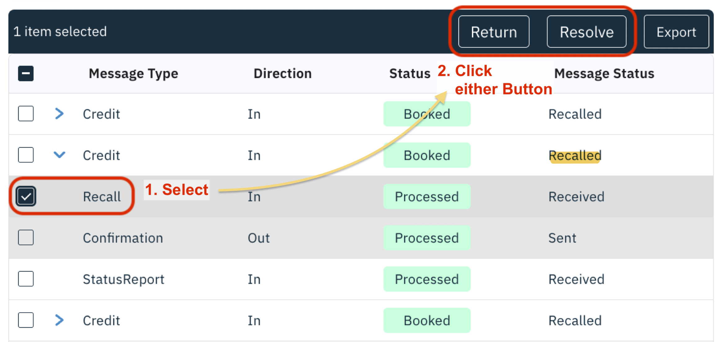 - Identify the inbound Credit in status Recalled